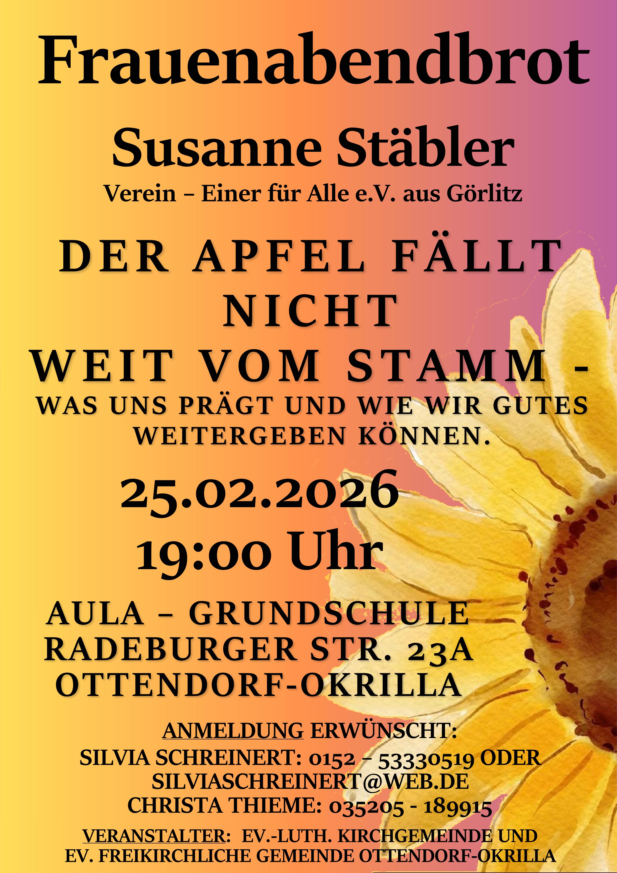 Liebe Frauen, wir laden Sie herzlich zu unserem nächsten Frauenabendbrot am Mittwoch, den 25.02.2026, ab 19 Uhr in die Aula der Grundschule ein. Wir bitten um Anmeldung bei Silvia Schreinert oder Christa Thieme. Falls Sie eine Kleinigkeit für unser Büffett mitbringen möchten, würden wir uns sehr freuen.